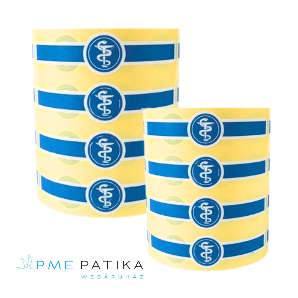 Megnevezés: 150mm hosszú, kék színű, nyomott üvegzáró címke patikai felhasználásra.